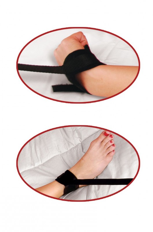 - Наручники и наножники из нейлона на липучках. Каждый манжет имеет нейлоновую ленту, которая крепится к ножкам кровати или стойке, что позволяет зафиксировать партнера в позе "морская звезда"!