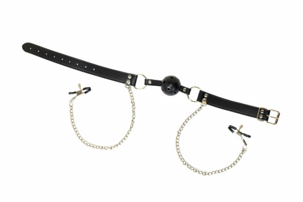 Потрясающий девайс для максимально экстремальных игр в стиле БДСМ, - дышащий кляп с зажимами на соски "Party Hard"!