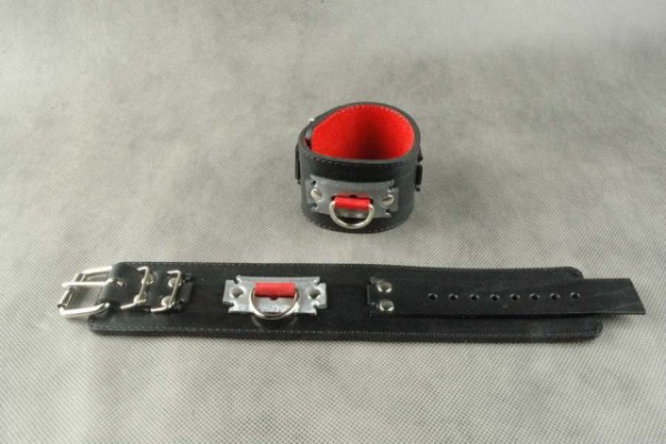 Выполнены наручники из натуральной кожи в черном цвете. Изнутри обшиты контрастным красным велюром. Декорированы наручники кожаной вставкой металлического цвета в виде лезвия, что придает особенный стиль и выглядит весьма элегантно!